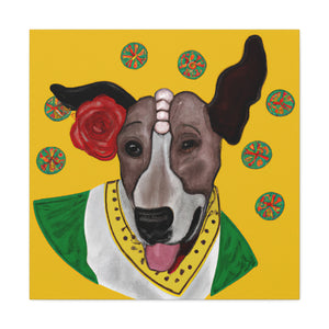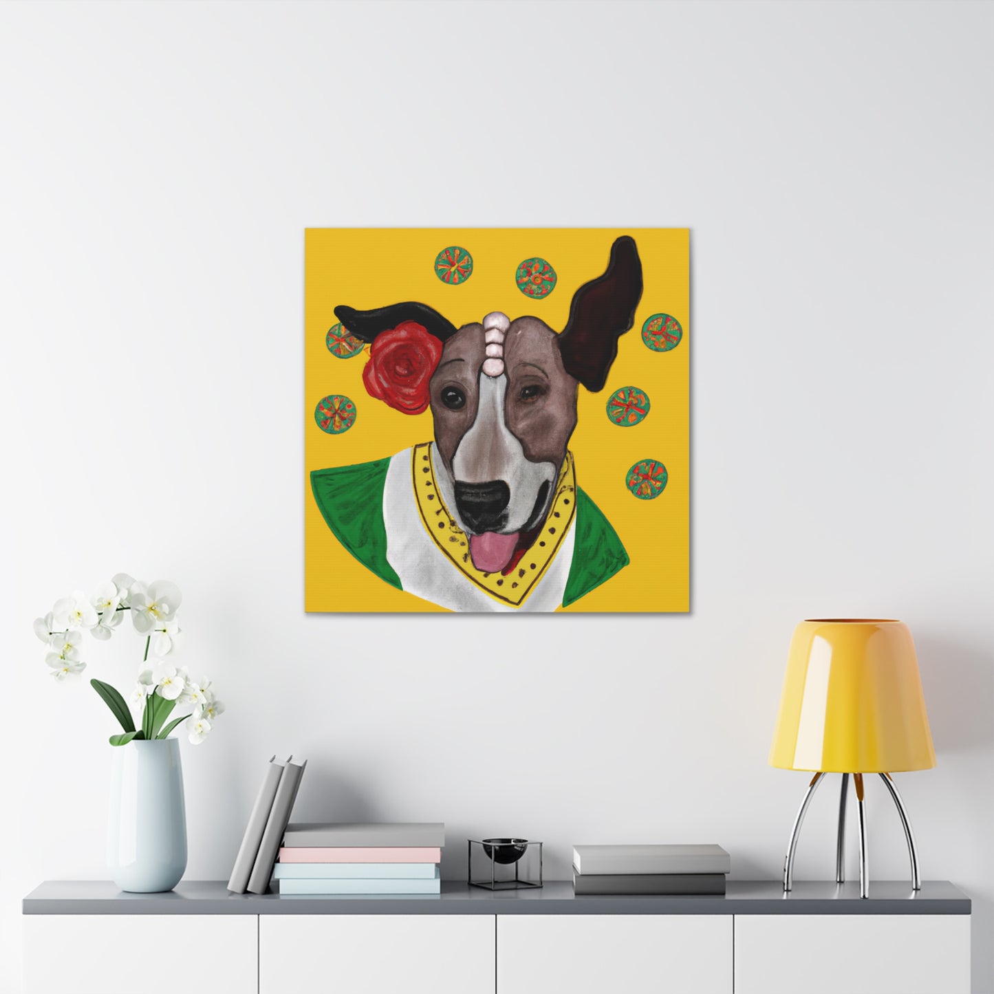 "Happy Dog in Frida Kahlo Inspired Canvas Print" by PenPencilArt