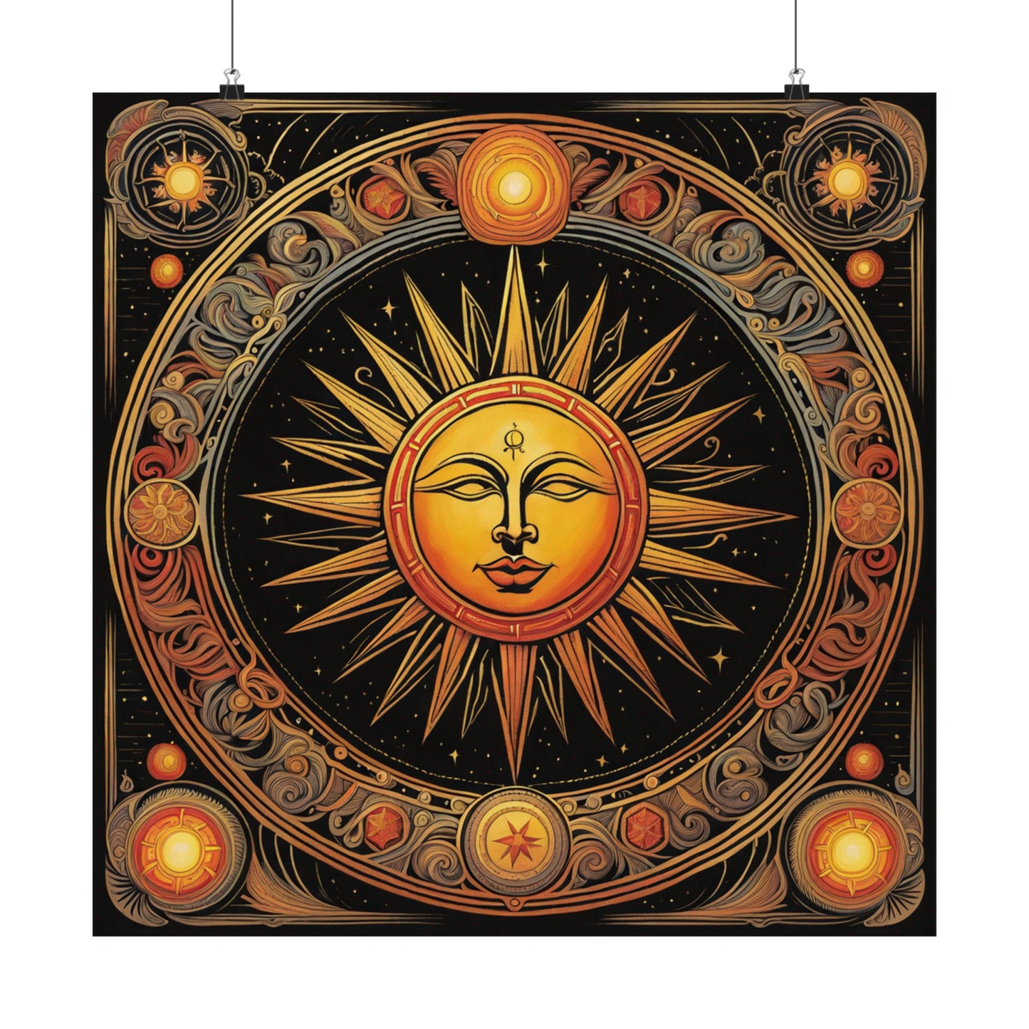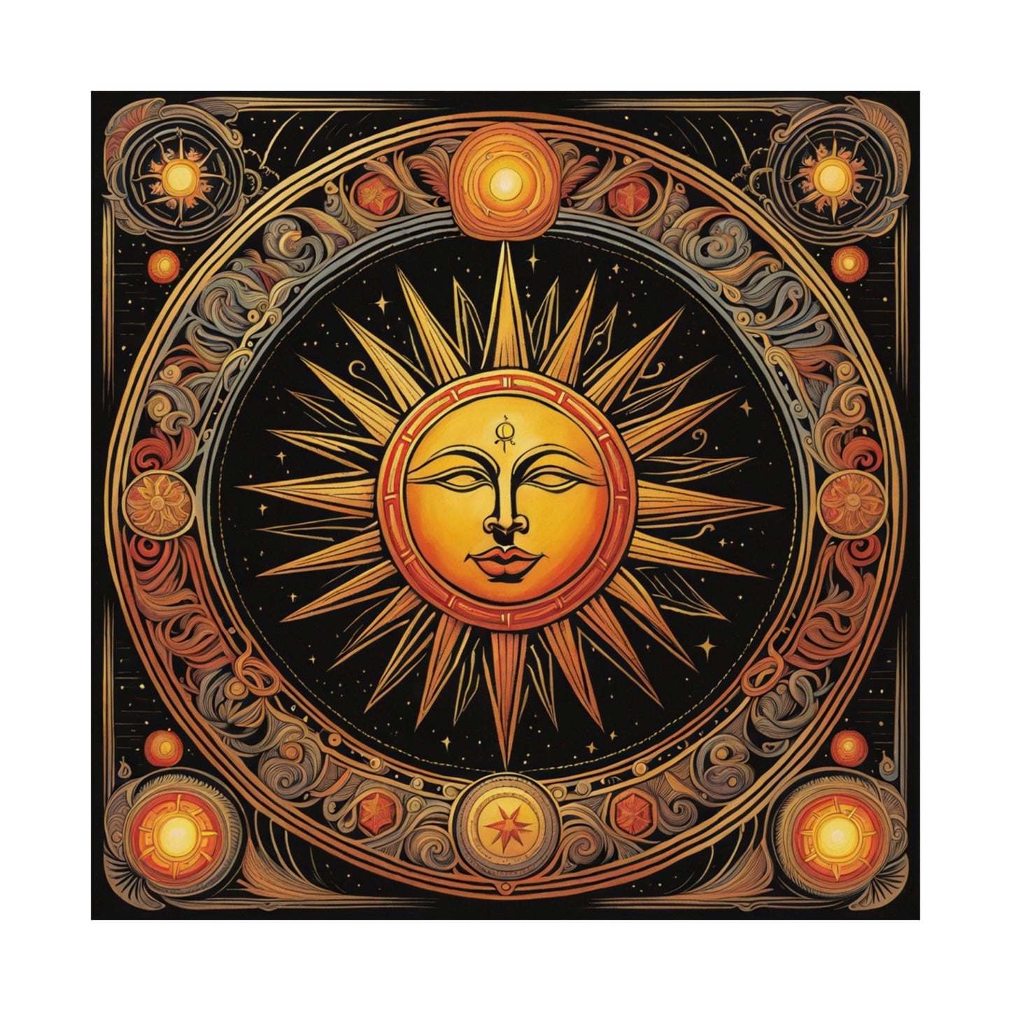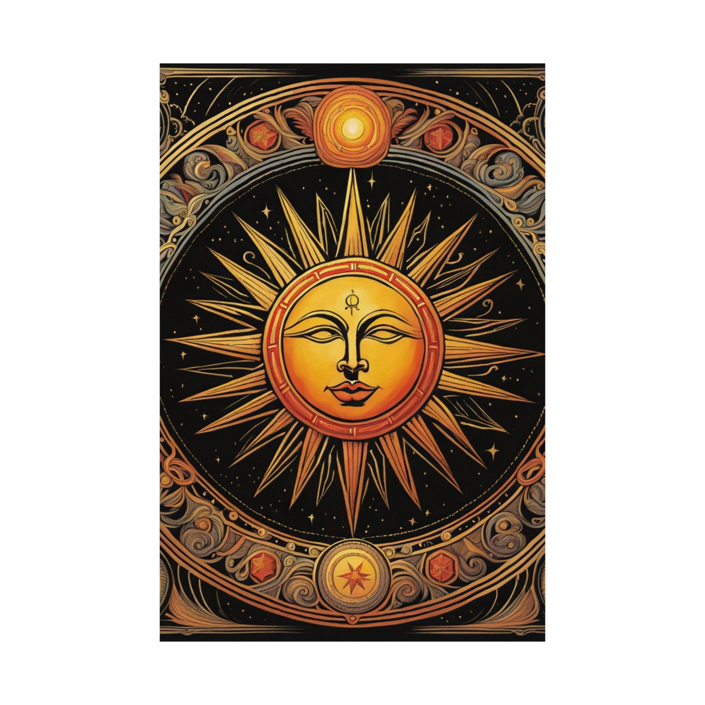 Featuring a modern giclée printing technique, this poster is created at the highest possible quality. The use of this modern printing style and high-quality inks means that each poster is truly unique to the home décor market. The high-resolution printing leads to an immaculate finish with crisp edges and accurate colours. The Sun print poster is the perfect canvas to be hung proudly in any living space.Symbolism for a Spiritual Environment