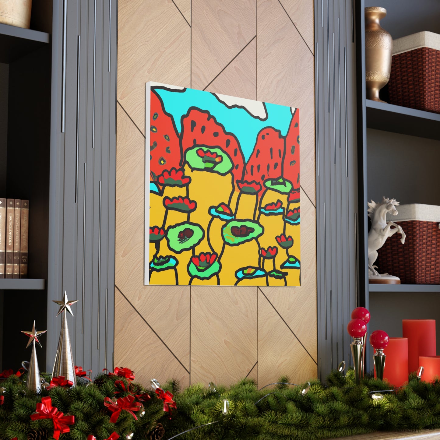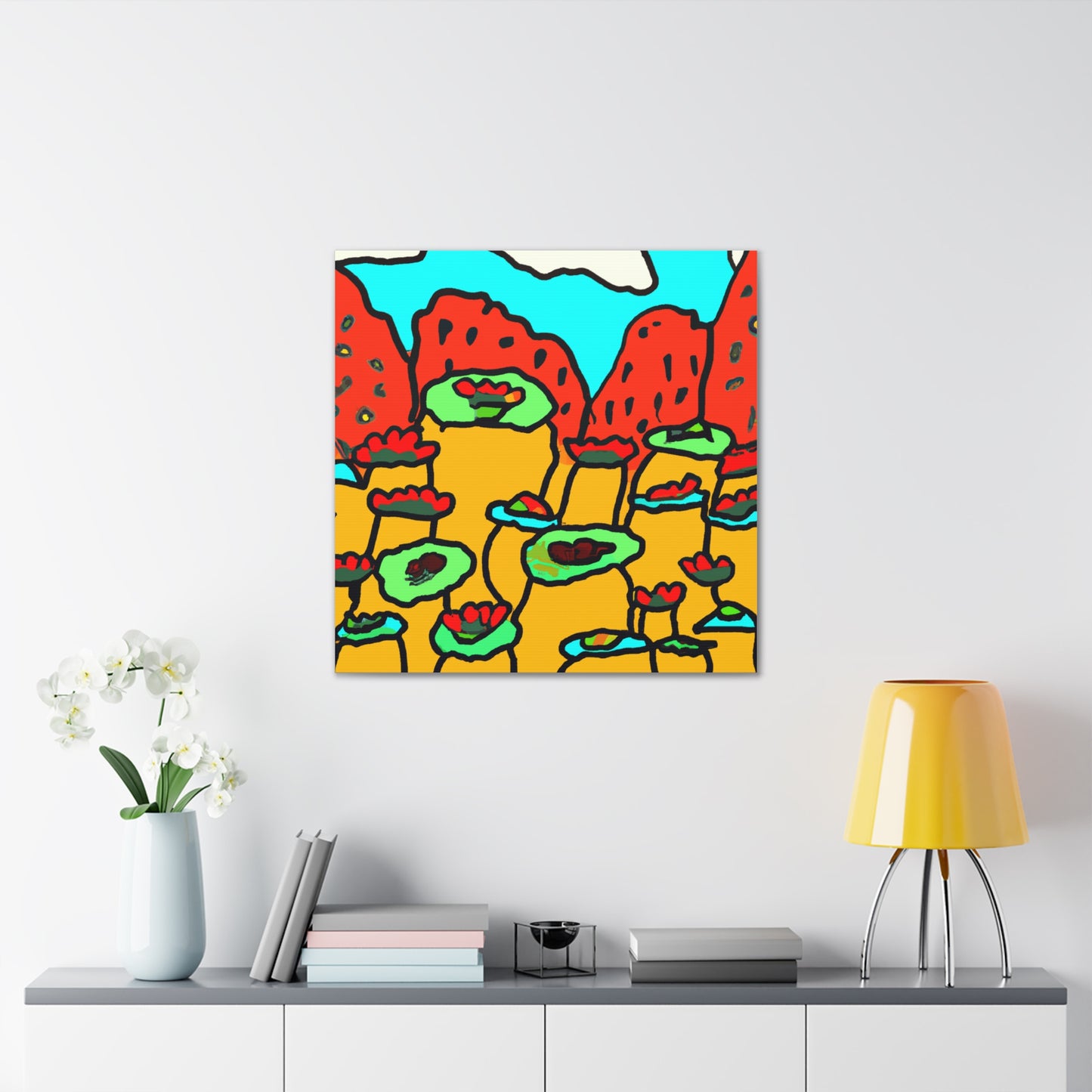 This vibrant canvas print of a desert landscape influenced by the art of Takashi Murakami will bring beauty and life to any wall space. Perfect for a home or office, this print canvas is sure to be a standout and conversation piece. Whether it's for the living room, bathroom, or a den, this expressive canvas art adds a creative, unique touch to all spaces.Celebrate the Japanese Aesthetic
